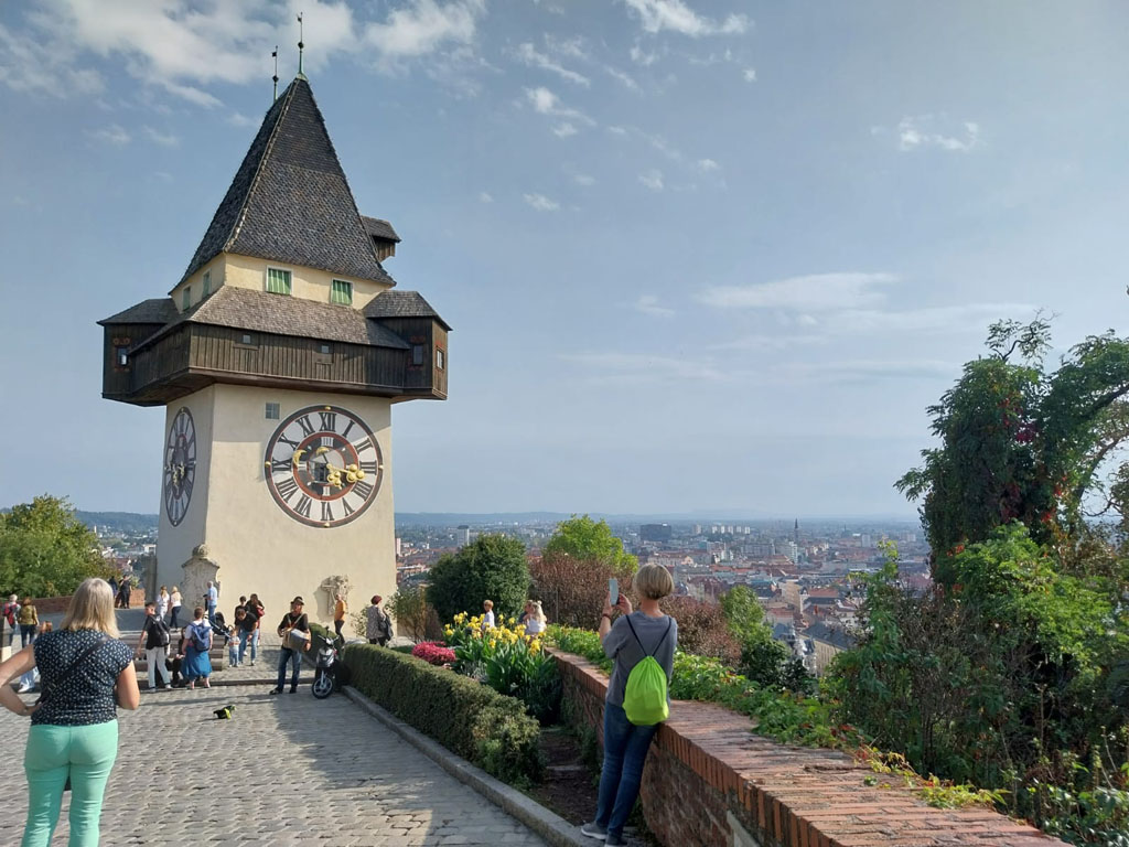Nachmittags haben wir, wie bereits am Wochenende, unterschiedliche Aktivitäten mit teilweise allen 43 Schülern gemacht und sind meistens erst abends wieder im Hotel angekommen. Wir sind zum Beispiel am Samstag zum Uhrenturm in Graz gefahren und durften dann von oben, in einer Rutsche mit ca. 35 km/h bis nach unten rutschen. Danach sind wir alle zusammen in dem Restaurant Airea 55 essen gegangen und sind erst spät wieder im Hotel angekommen. Am Dienstag durften wir dann das Arnold-Schwarzenegger-Museum in Thal besuchen und haben sogar von einem alten Schulfreund von Schwarzenegger einige Dinge erklärt und erzählt bekommen. Später haben wir uns noch die Fuchskirche in Thal angesehen, welche eine besondere architektonische Bauweise hatte. Am Tag darauf haben wir die Gruppe aufgeteilt und meine Gruppe ist dann im Hotel klettern bzw. Bouldern gegangen und wir durften ebenfalls über den Skywalk, welcher eine Art Kletterparkour war, laufen. Am Donnerstag tauschten wir dann die Gruppen und fuhren nachmittags zusammen mit der 9. Klasse des Oeversee-Gymnasiums auf den „Schöckl“ und durften dort erstmal Sommerrodelbahn fahren. Später haben wir dann dort Abendbrot gegessen und sind im Dunkeln nach unten gelaufen, wo uns der Bus wieder abgeholt hat.