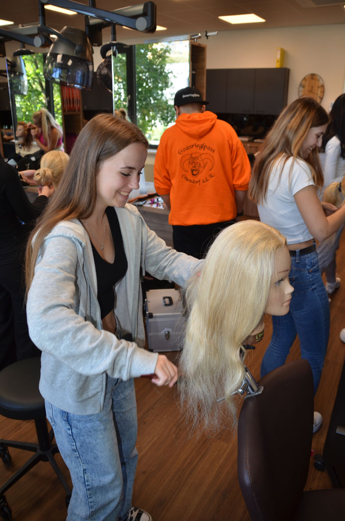 Drei Mal in der Woche hatten wir praktische Arbeit im Salon, welcher sich direkt in der Schule befand. Lockenwickler, Dauerwellen und Stufen schneiden erlernte ich dort an Friseurköpfen. Obwohl es mein erstes Mal mit der Arbeit am Frisiermodell war, wurde ich viel gelobt, was mich sehr gefreut hat. Mein Highlight der ganzen Woche war, dass ich spontan Stufen geschnitten bekommen habe, ohne etwas dafür zu bezahlen.